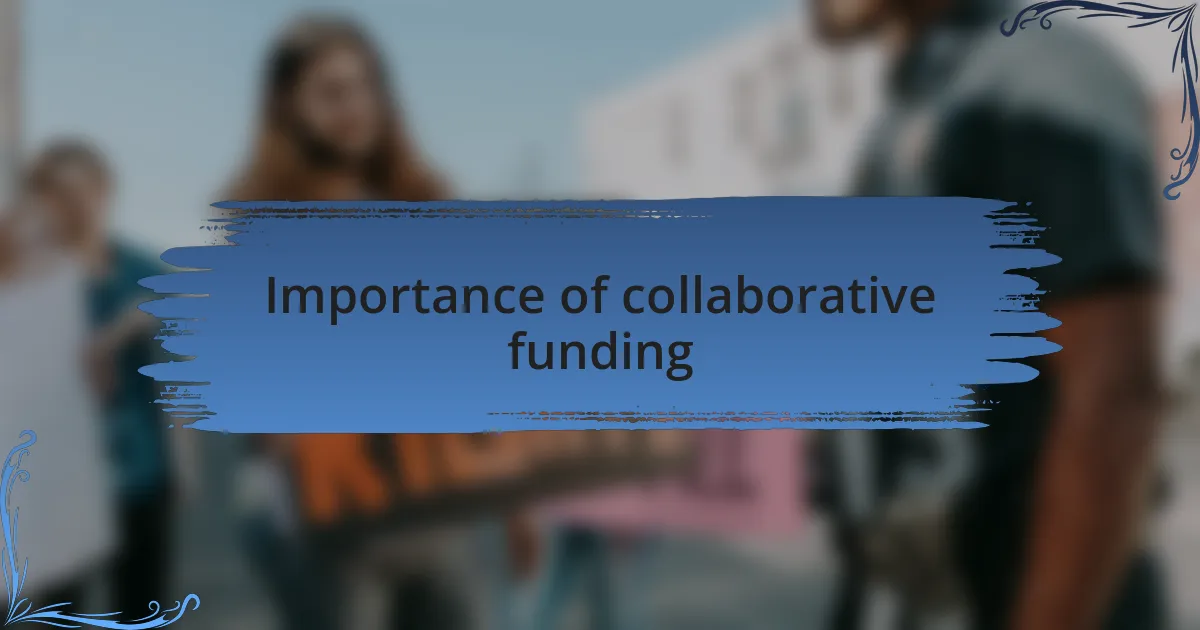 The importance of collaborative funding goes beyond mere dollars; it inspires a culture of shared responsibility. I remember the excitement during brainstorming sessions where each participant contributed their expertise. It felt like a melting pot of creativity—how could we not come up with innovative solutions when we were drawing from such a diverse set of insights? This collaborative mindset not only enriches project outcomes but also cultivates a sense of ownership and commitment among all involved.