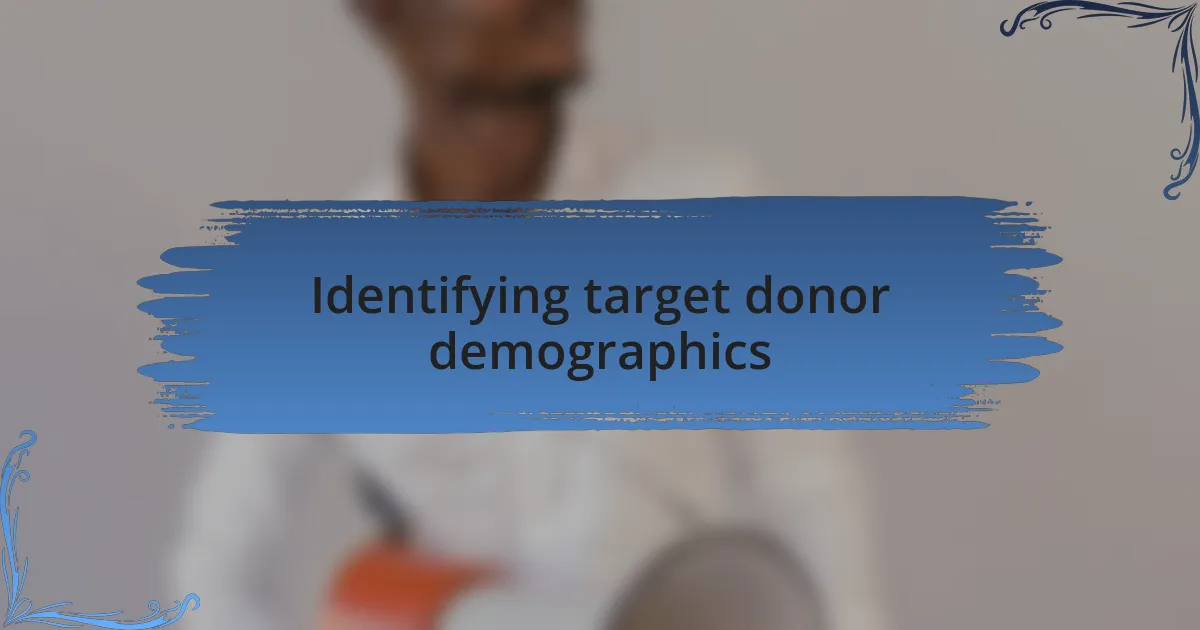 Identifying target donor demographics is essential for tailoring your outreach effectively. I remember working on a campaign where we segmented our donor list based on age and professional backgrounds. This strategic approach allowed us to craft messages that resonated with each group uniquely. Have you thought about how understanding your donors’ lives can impact your messaging?
